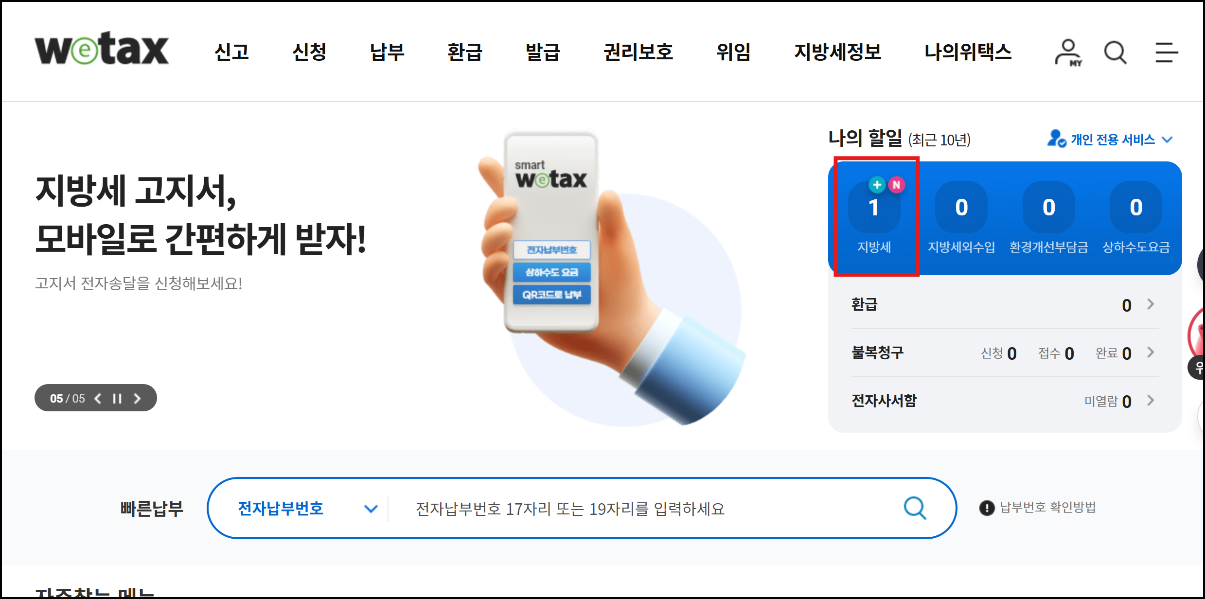 오른쪽 위에 나의 할 일 창을 보시면 지방세에 뭔가 있는 것이 보입니다. 지방세를 클릭합니다.