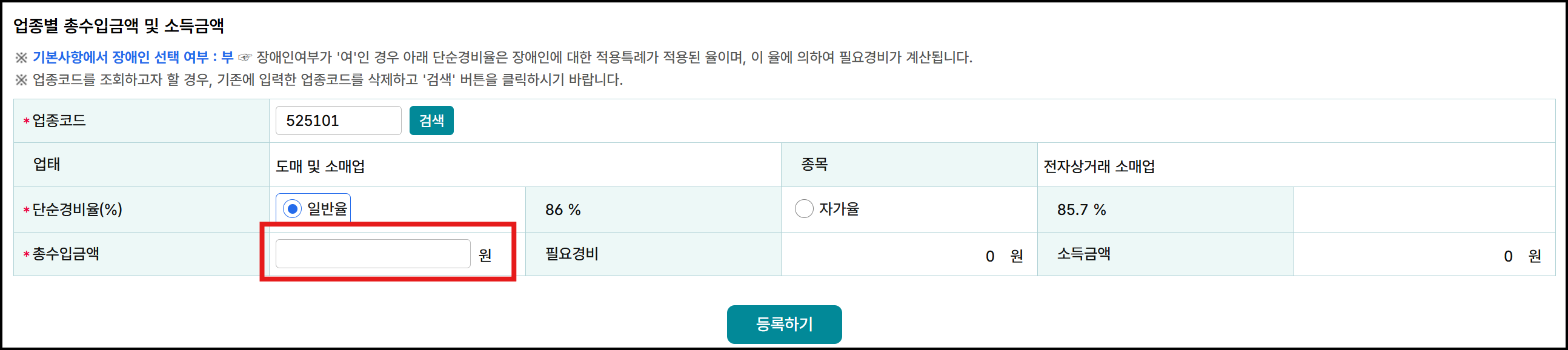 새로 뜨는 창에서 수입금액을 모두 더해서 입력해 주시면 됩니다. 나머지는 알아서 입력됩니다.