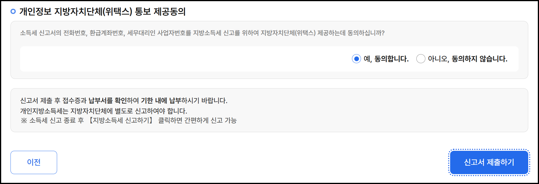 총 납부할 금액을 확인하고 신고서 제출하기를 누르면 종합 소득세 신고가 완료됩니다.