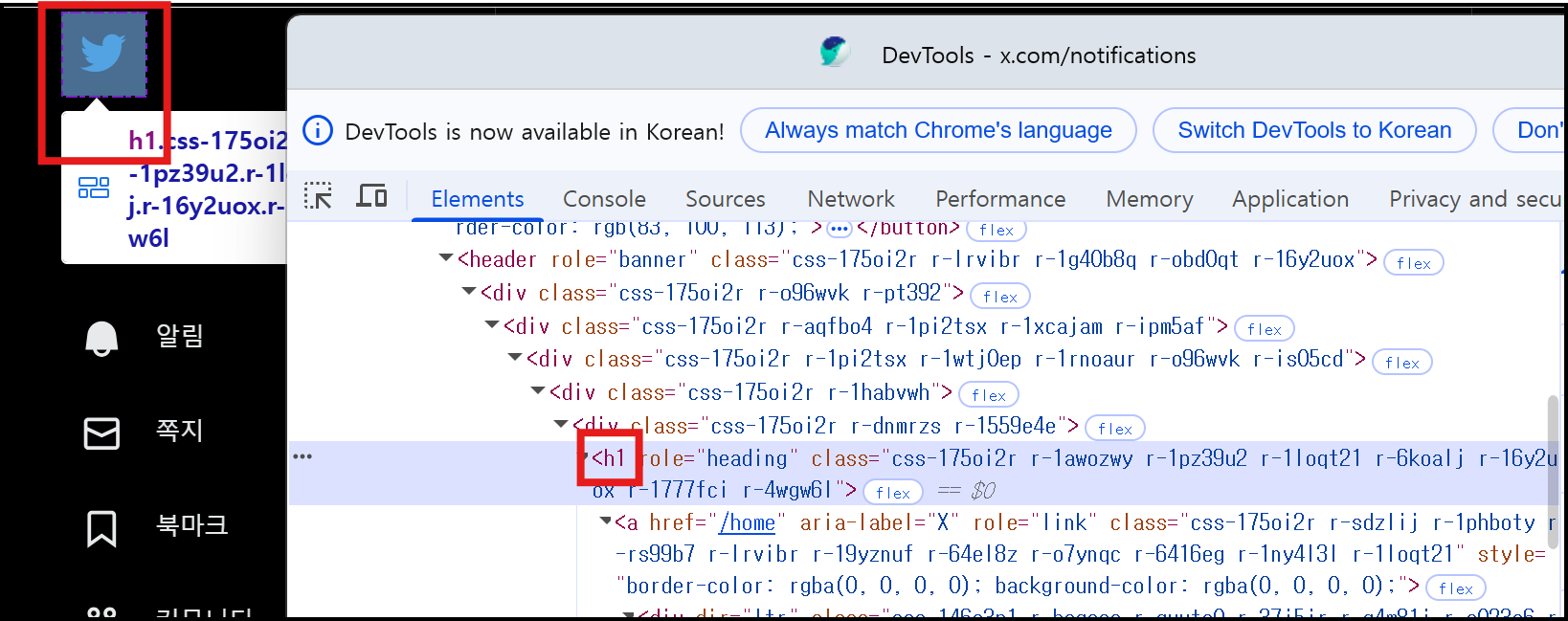 트위터를 살펴보면 로고에 <h1> 태그를 사용한 것을 확인할 수 있습니다. 주로 웹페이지 전체 제목에 사용하는 태그로 로고에 많이 쓰입니다. 이런식으로 그 외에도 많은 태그들로 이루어진 것을 알 수 있습니다.