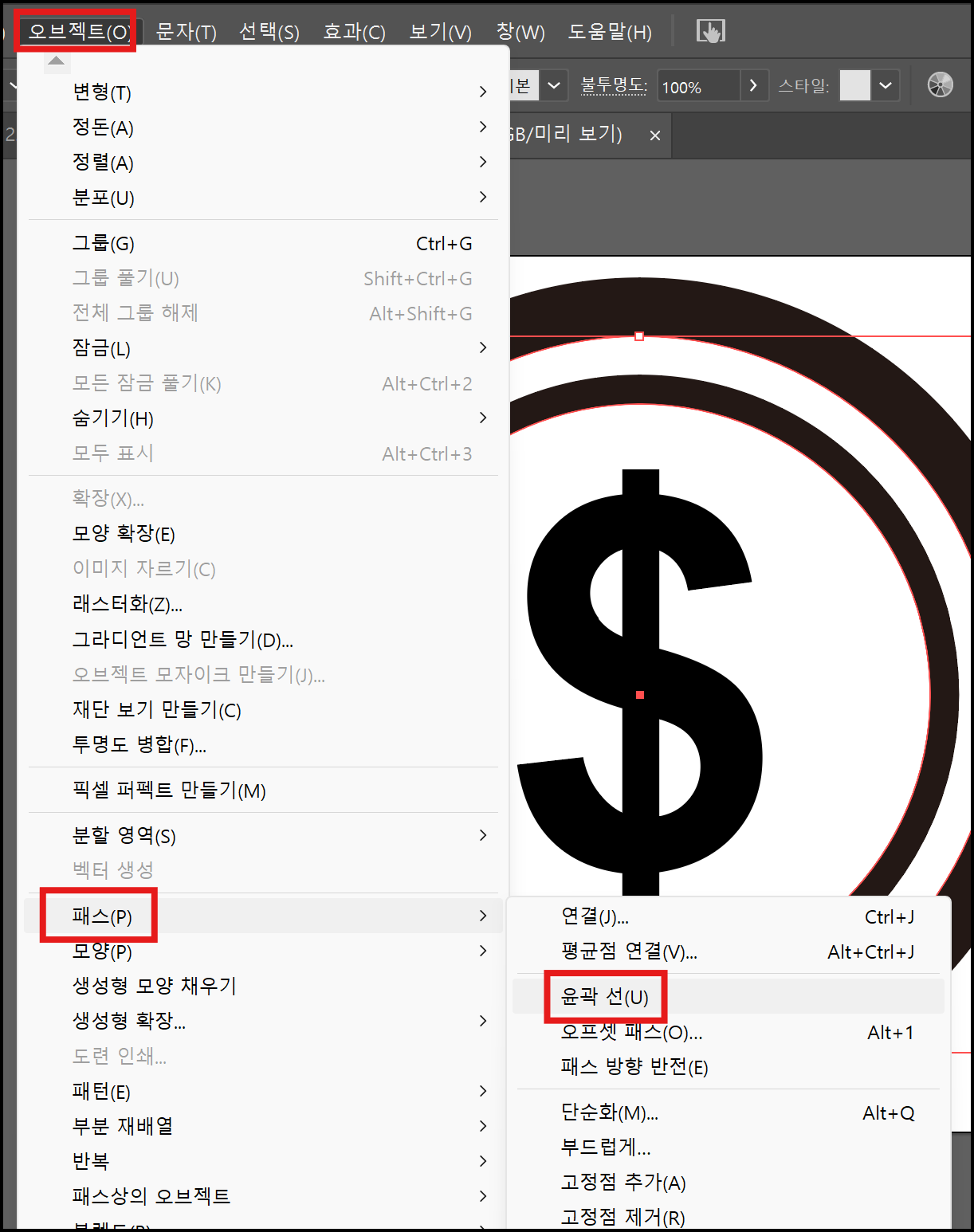 - 상단 메뉴에서 [오브젝트 > 패스 > 윤곽 선]을 선택합니다.