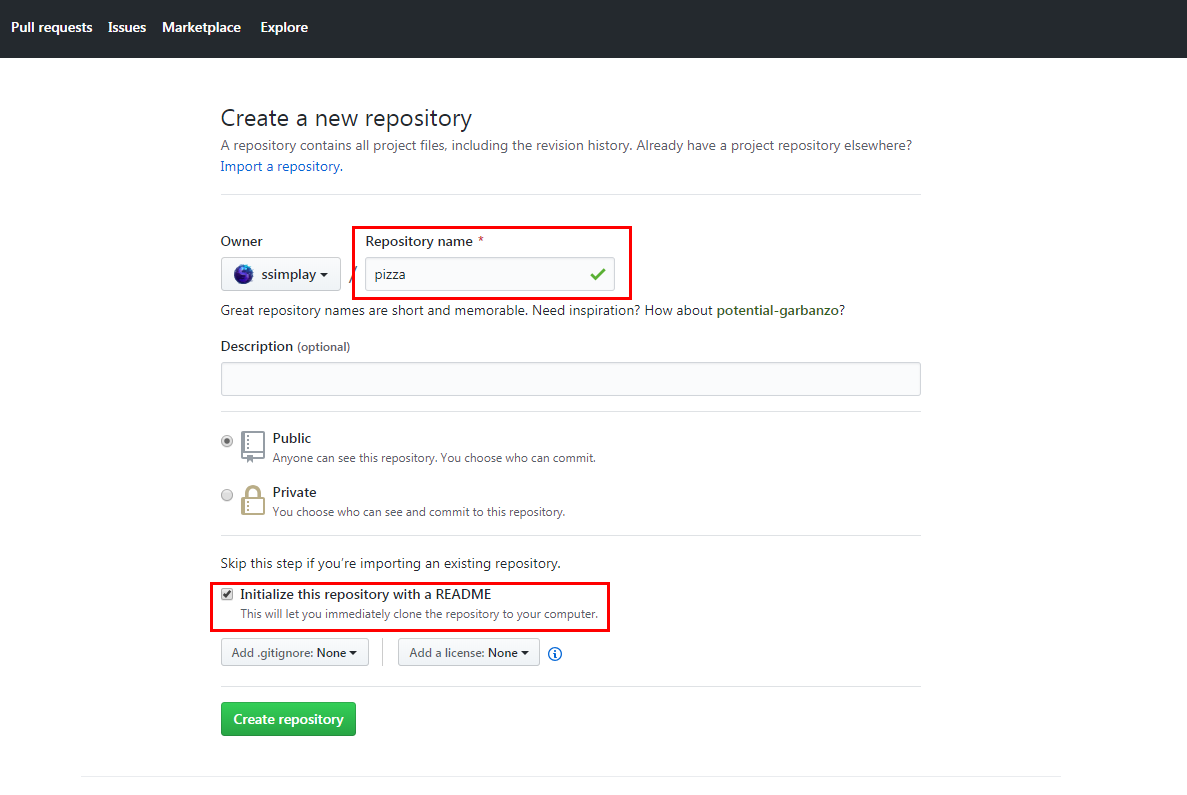 Create repository버튼을 눌러 새 프로젝트를 생성해줍니다.