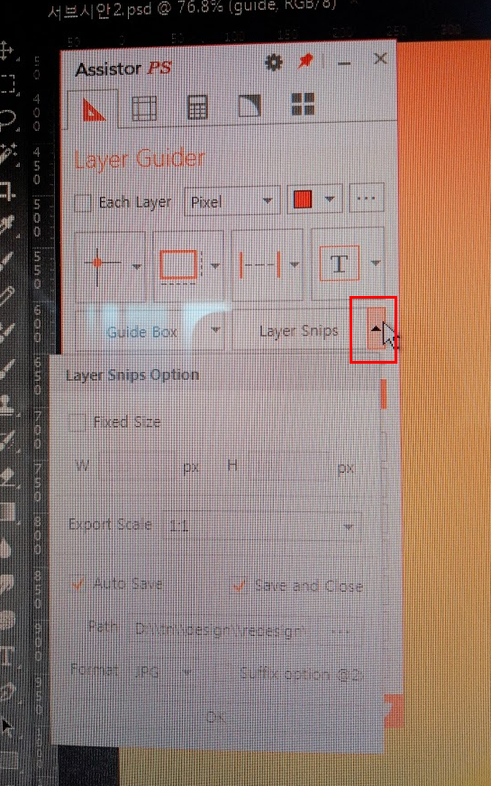 설정창은 Layer Snips버튼 오른쪽에 작은 삼각형을 누르면 펼쳐서 볼 수 있습니다.