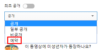 업로드 화면에서 오른쪽 중간쯤 보시면 공개라고 쓰여있는 칸이 있습니다.