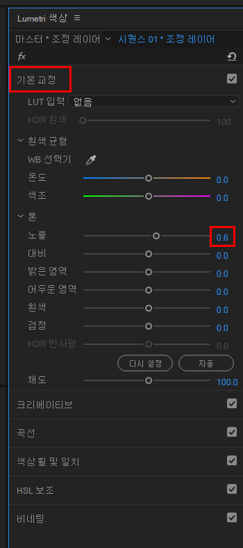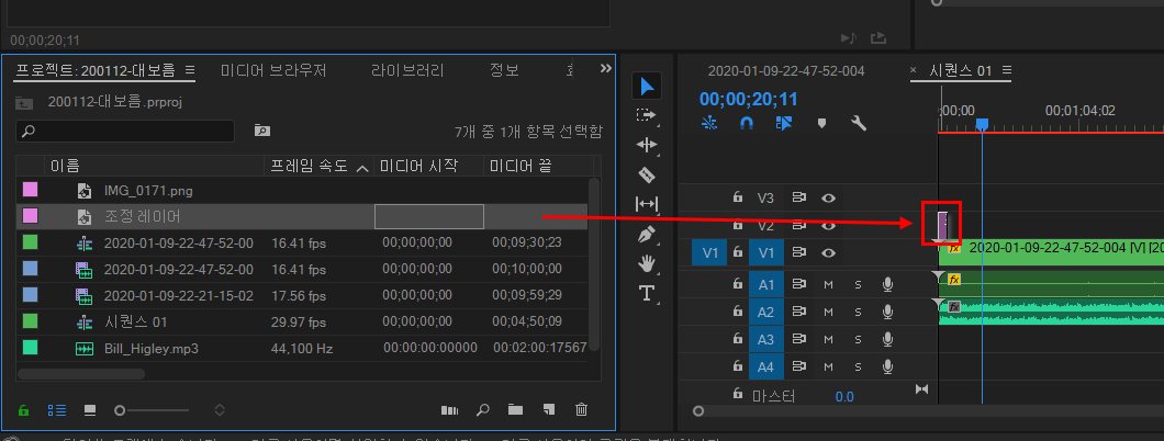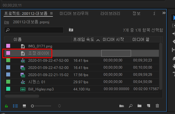 프로젝트에 조정 레이어가 추가된 것을 확인할 수 있습니다.