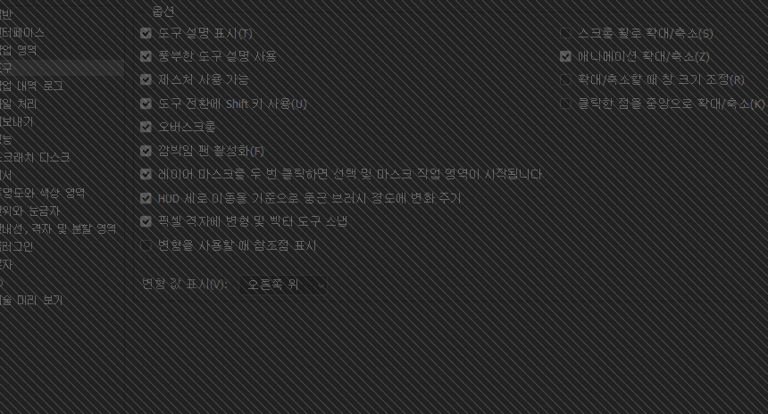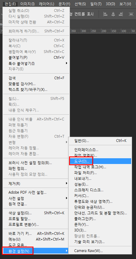 편집 > 환경설정 > 도구 메뉴에 들어가 줍니다.