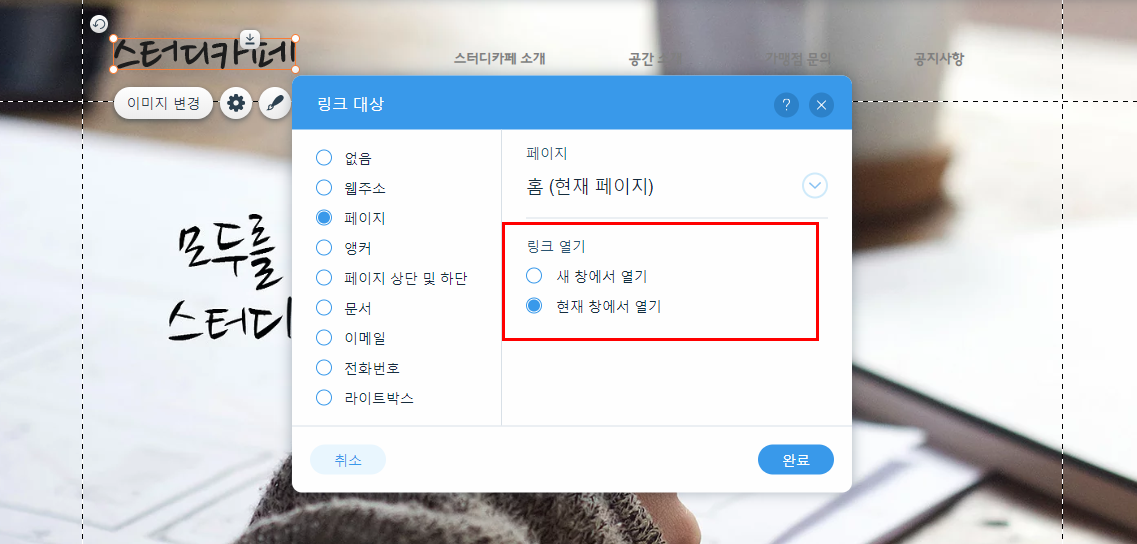 완료를 누르시면 로고에 링크가 걸립니다.