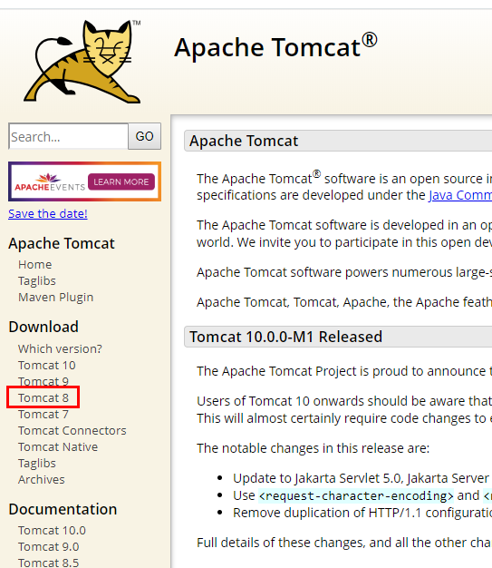 Download > Tomcat8을 눌러주세요.