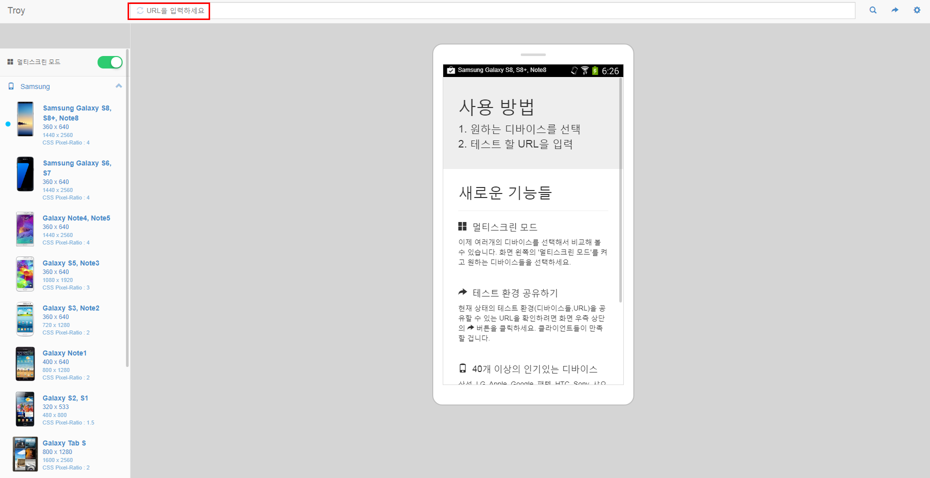 이쪽에 모바일로 보고 싶은 주소를 입력하면 가운데 핸드폰 모양 화면에서