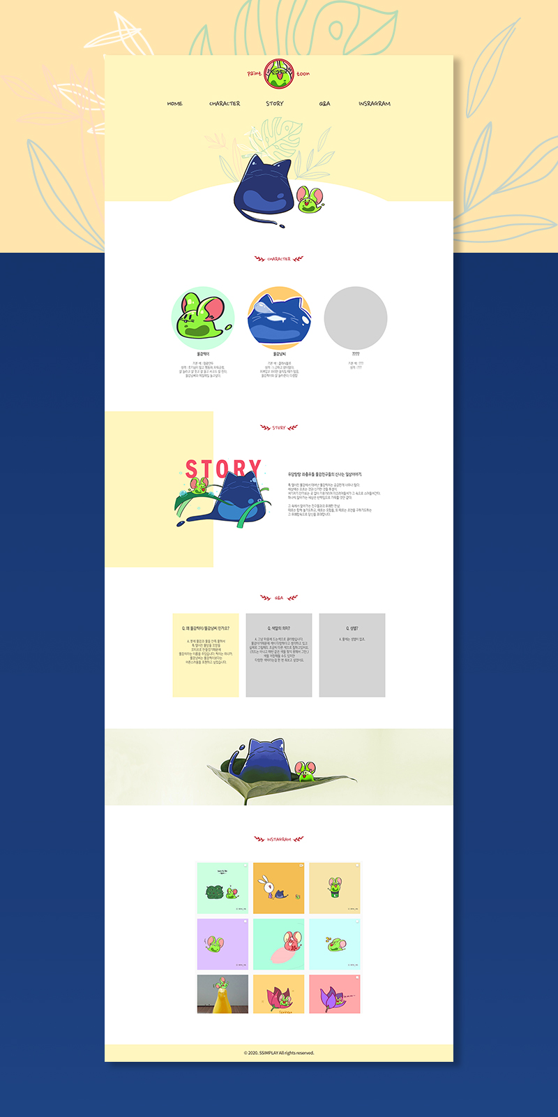 사이트는 연한 노란색을 포인트 컬러로 작업했어요. 캐릭터가 잘 보여야 하는 사이트라 연한 색을 골랐어요.