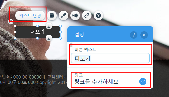 클릭하면 텍스트 변경이라는 버튼이 생기는데 텍스트 변경과 링크를 추가할 수 있어요.