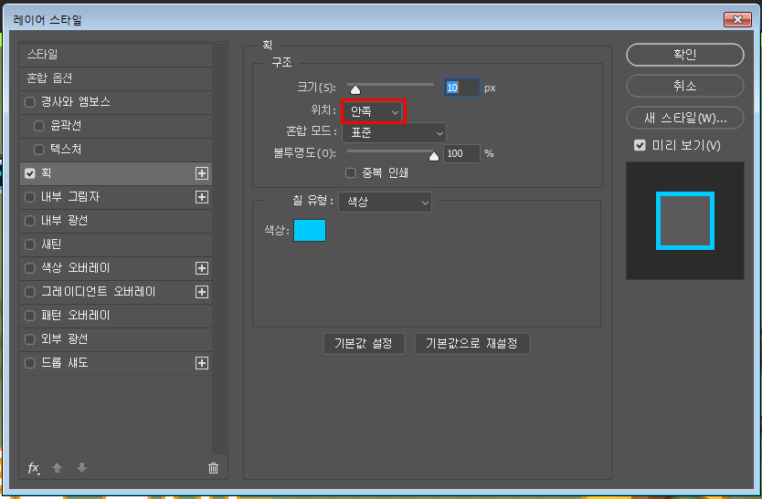 위치는 안쪽을 선택해주세요. 안쪽만 테두리 모서리가 각진 모양으로 나와요.