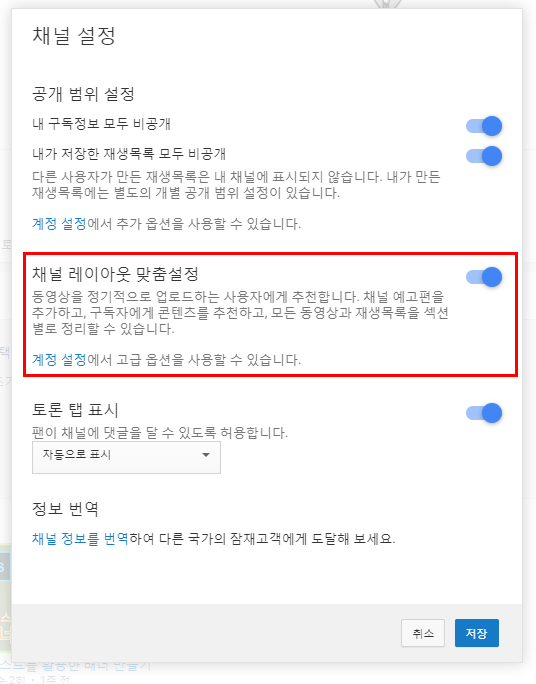 채널 레이아웃 맞춤 설정을 활성화시켜주세요. 저는 이미 활성화가 되어있네요.