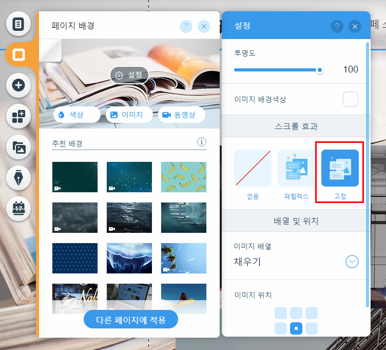 여기서 고정을 눌러주시면 배경 이미지가 고정이 되면서 사이즈가 적절하게 조정이 됩니다.