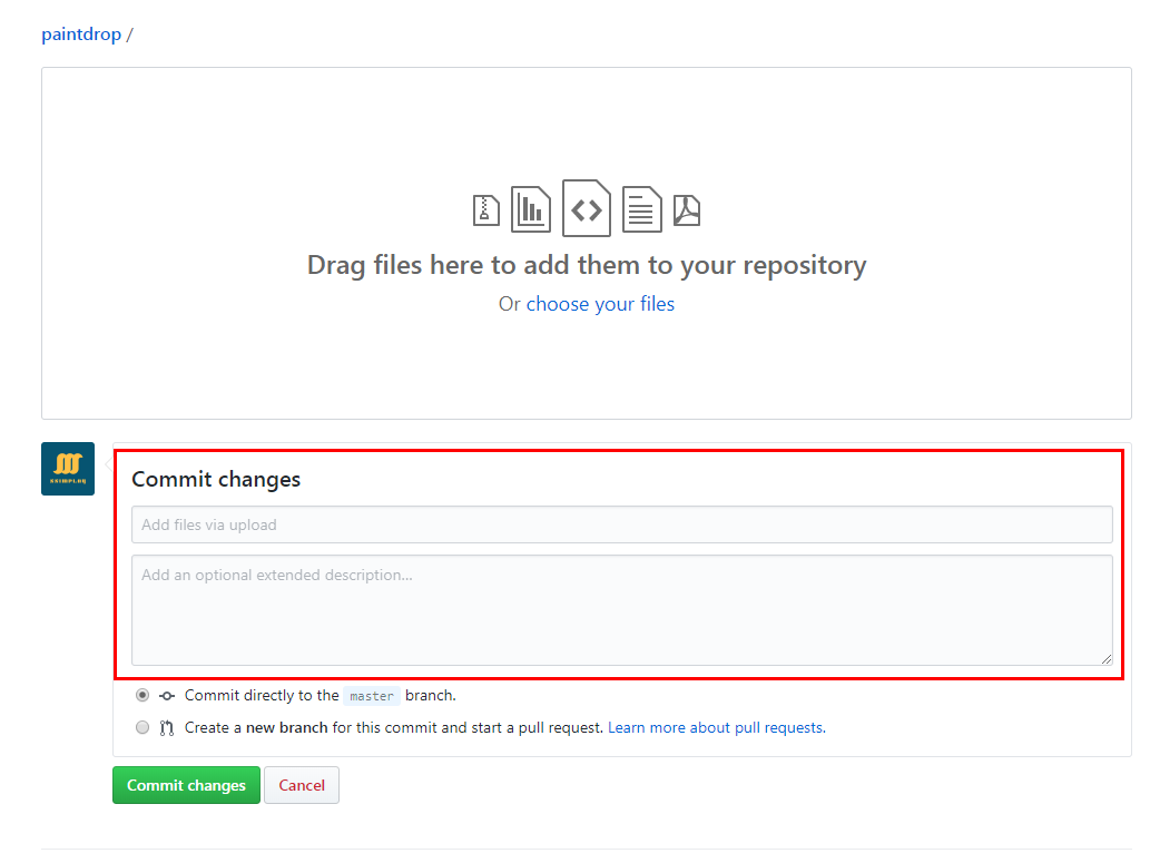 파일도 업로드가 다 됐고, 버전도 다 적어줬다면 아래에 Commit changes라고 적힌 초록색 버튼을 눌러서 저장해줍니다.