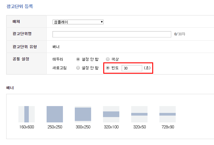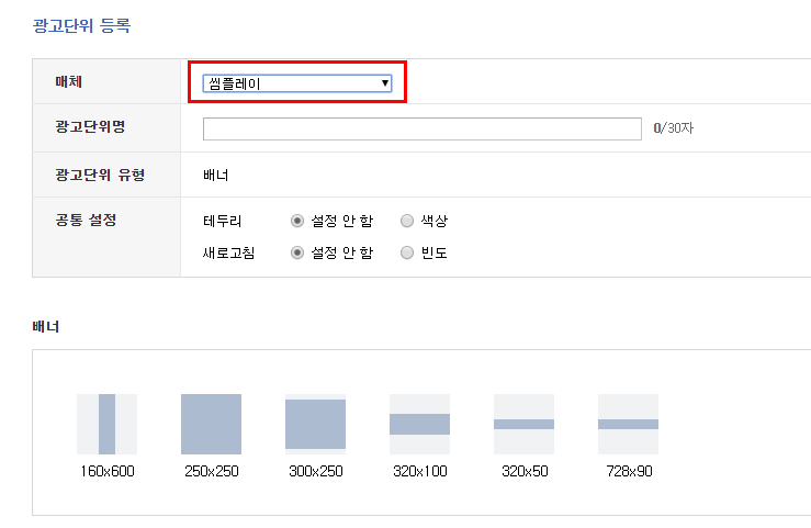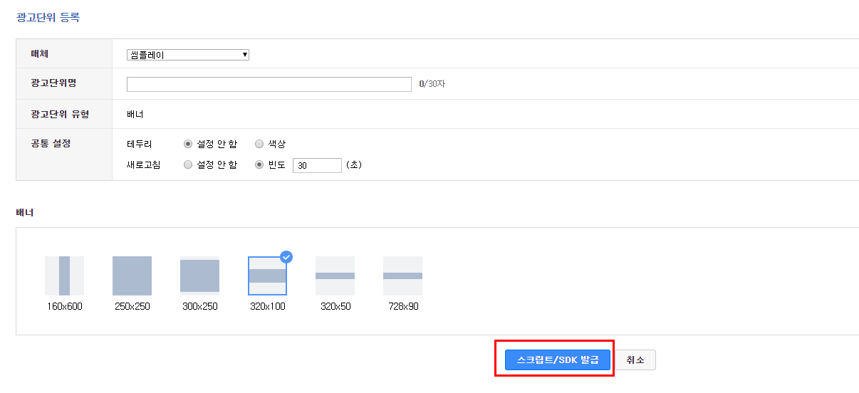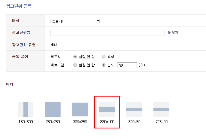 여기는 배너 사이즈를 정할 수 있어요. 저는 320*100 사이즈를 골라볼게요.