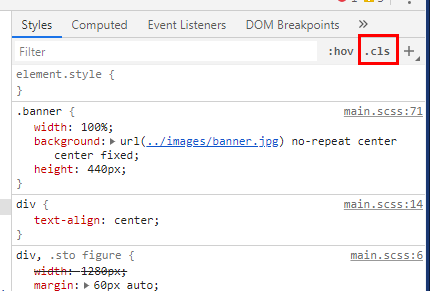 오른쪽에 css가 잔뜩 적힌 창이 있을 거예요. 그쪽에서 오른쪽 상단에 보시면 .cls이라고 적힌 글이 보이실 거예요.
