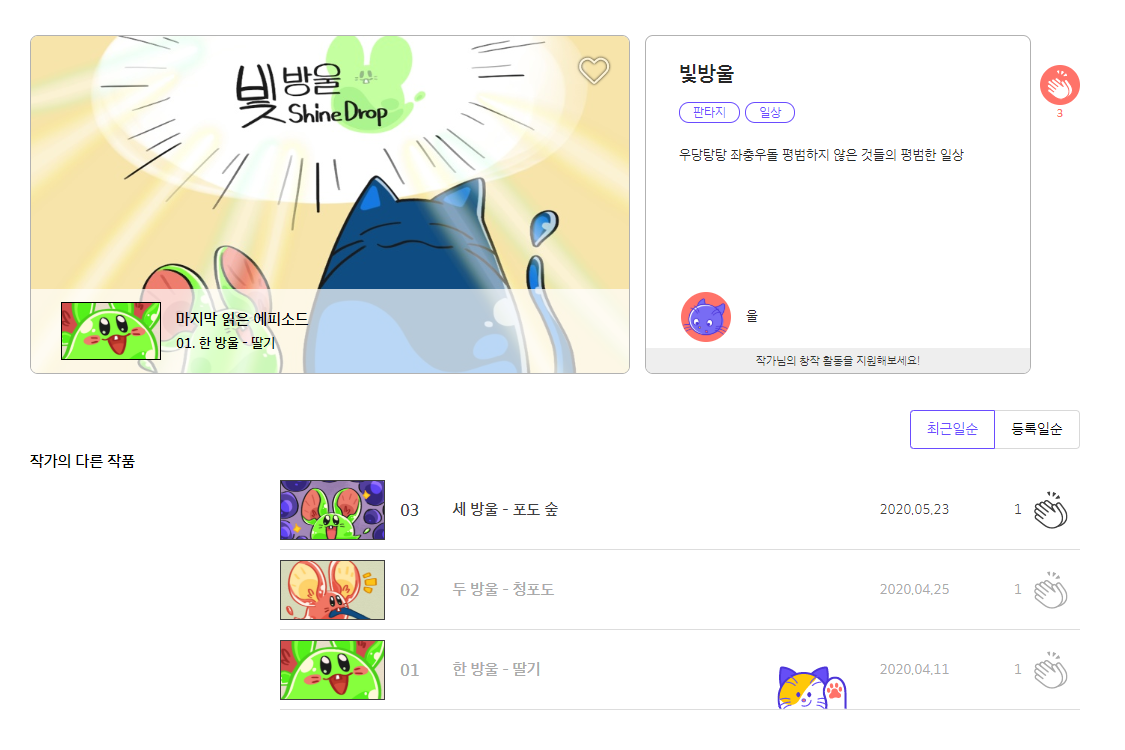 연재라고 하니까 엄청 거창해 보이지만 그런 건 아니고 조금씩 그리면서 한 방울씩 한 방울씩 올리고 있답니다.