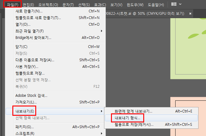 파일 > 내보내기 > 내보내기 형식을 눌러주세요.