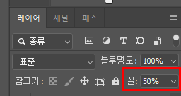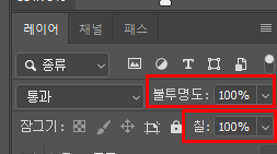 레이어 패널 위쪽에 보시면 있습니다. 아마 불투명도와 칠 어느 쪽을 줄여도