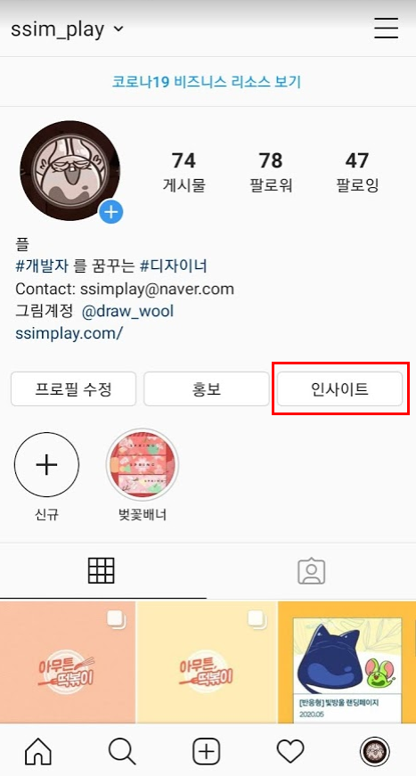 씸플레이 계정은 지금 만들어서 확인할 수 없어서 다른 계정의 인사이트를 잠시 가져와봤어요.