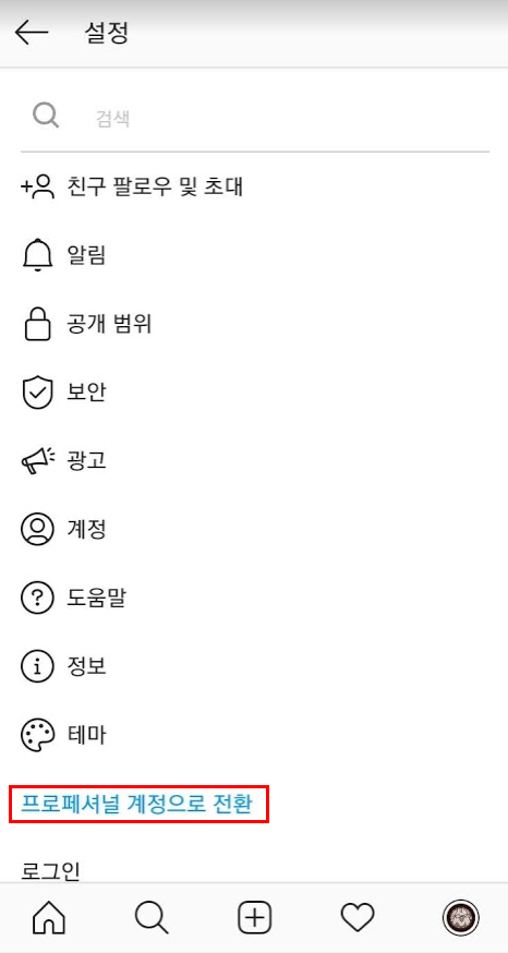 설정에서 쭉 내리다 보면 중간쯤에 파란 글씨로 프로페셔널 계정으로 전환이라는 글씨가 있을 거예요.