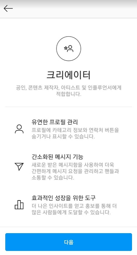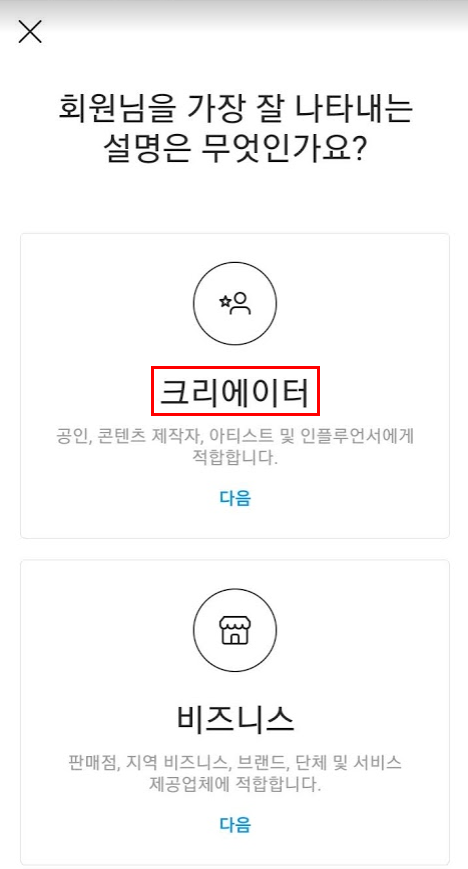 저는 크리에이터를 선택할게요. 크리에이터에서 다음 버튼을 눌러주세요.