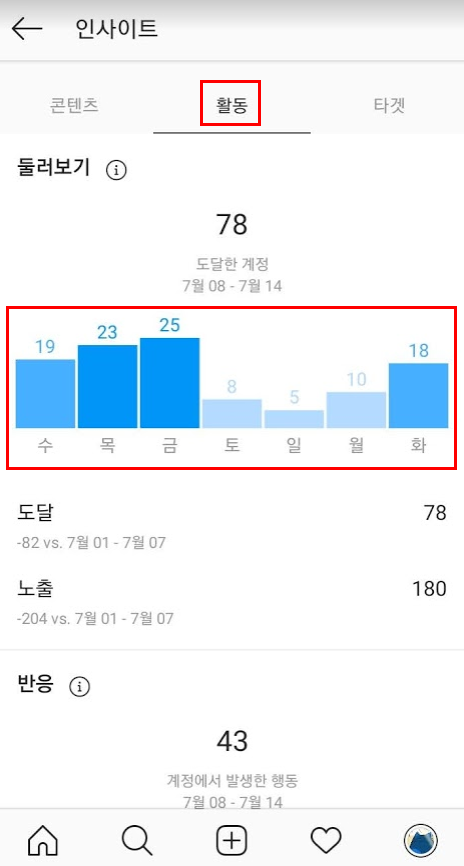 프로페셔널 계정으로 전환하면 이렇게 전에 없던 인사이트 기능을 사용할 수 있어요.