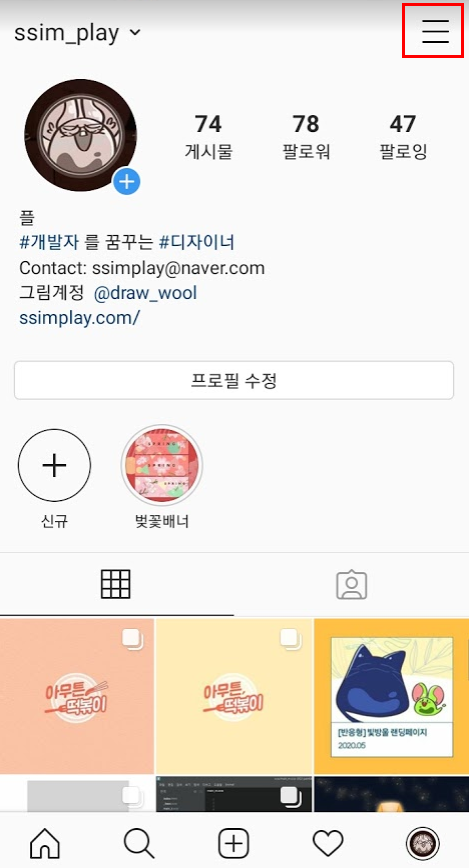 오른쪽 위에 햄버거 메뉴가 있을 거예요. 딴딴딴 하고 줄 세 개가 있는 아이콘이 있죠? 이걸 햄버거 메뉴라고 부른답니다.