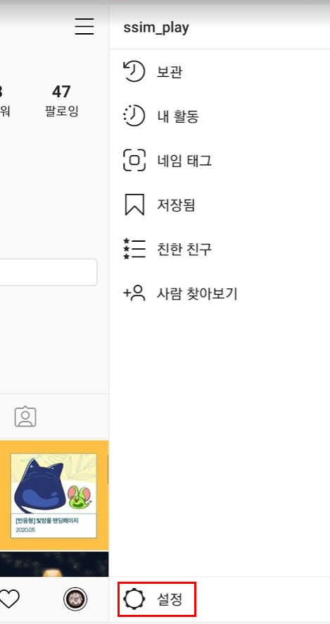 쭉 아래로 시선을 내려주시면 설정 버튼이 있어요. 설정 버튼을 눌러줍니다.