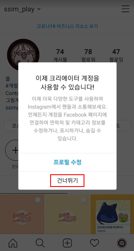다만 계정 전환을 한 뒤 올리는 게시물부터 적용이 된답니다.