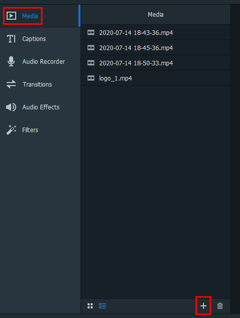 맨 위 미디어 메뉴를 열고 아래쪽 +버튼을 눌러서 편집을 원하는 영상을 불러와주세요.