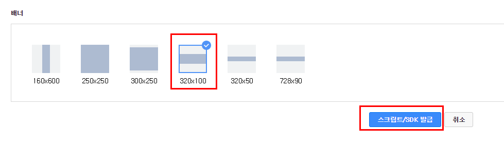 마음에 드는 배너 사이즈를 선택하고 스크립트 발급 버튼을 누릅니다.