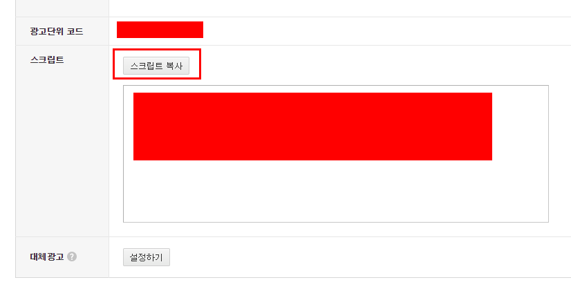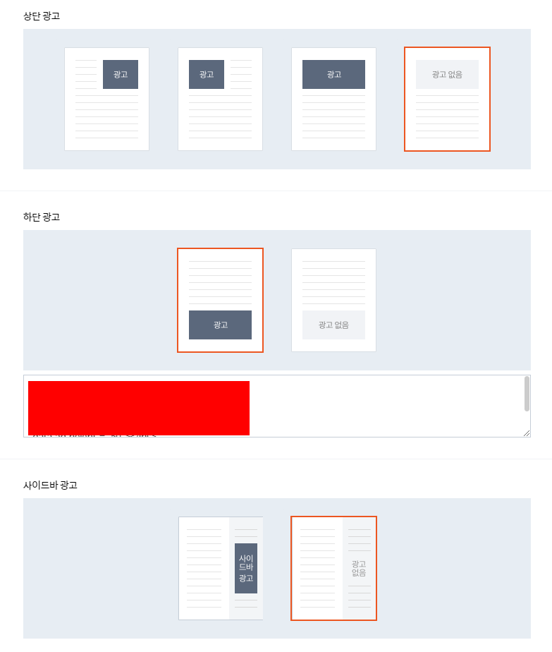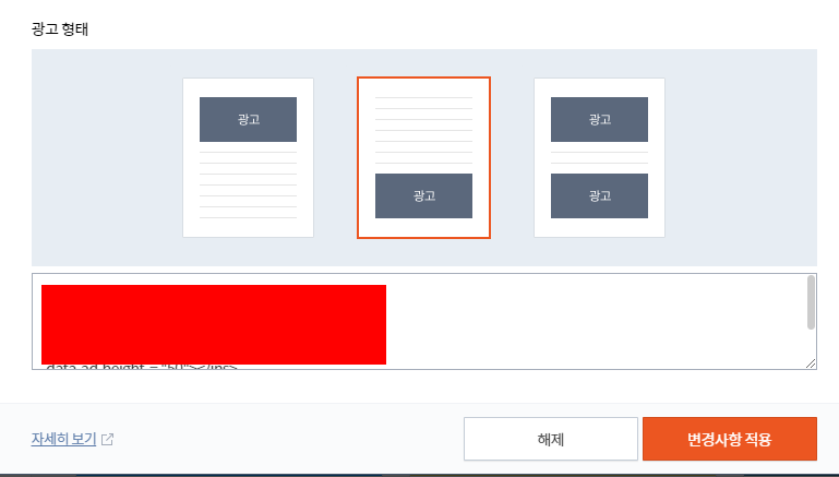 광고 형태를 선택해주시고 아래에 복사한 스크립트를 붙여 넣어 줍니다.