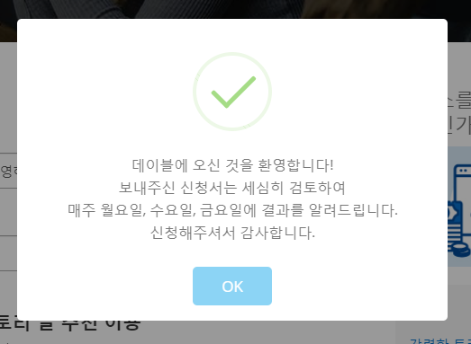 설정창이 뜨는데 이 데이블 신청하기 버튼을 누르면 홈페이지로 갈 수 있어요. 클릭해줍니다.