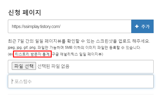 주소는 자신의 티스토리 블로그 주소를 넣어주시면 되고, 스크린샷은 예시에 티스토리 방문자 통계가 있네요.