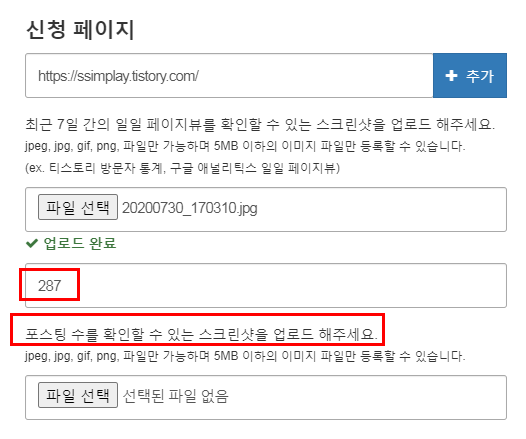 포스팅 수를 적으면 확인할 수 있는 스크린샷을 요구하는데요. 방금 그 글 관리 페이지를 캡처해서 보내면 될 것 같네요.