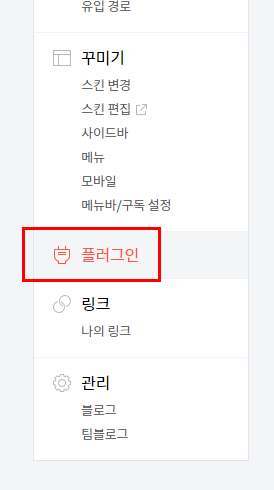 티스토리 관리 페이지로 들어가 주시면 왼쪽 메뉴 중 플러그인 메뉴가 있어요.