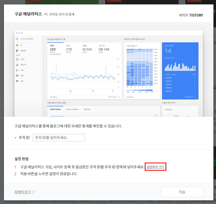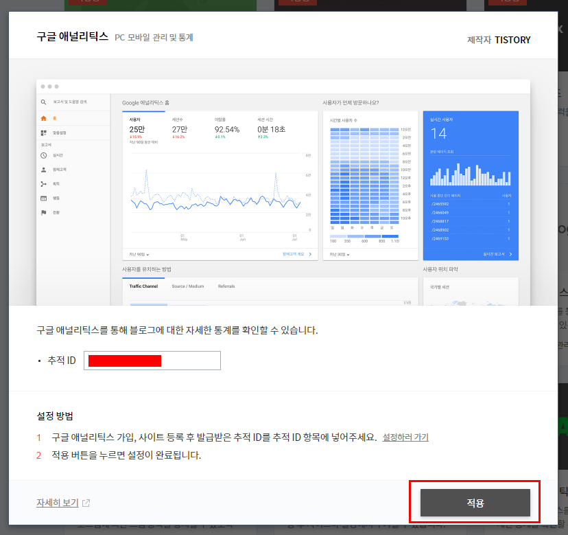 다시 티스토리로 돌아와 추적 아이디를 넣어주시고 적용을 눌러주세요.