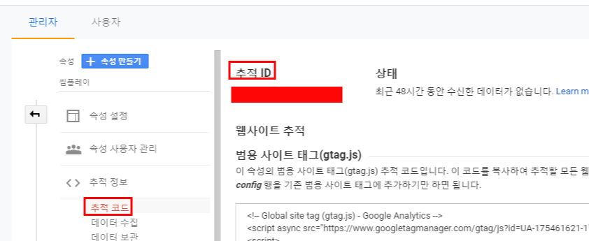애널리틱스에서 추적 코드 메뉴로 들어가면 쉽게 다시 찾을 수 있습니다.