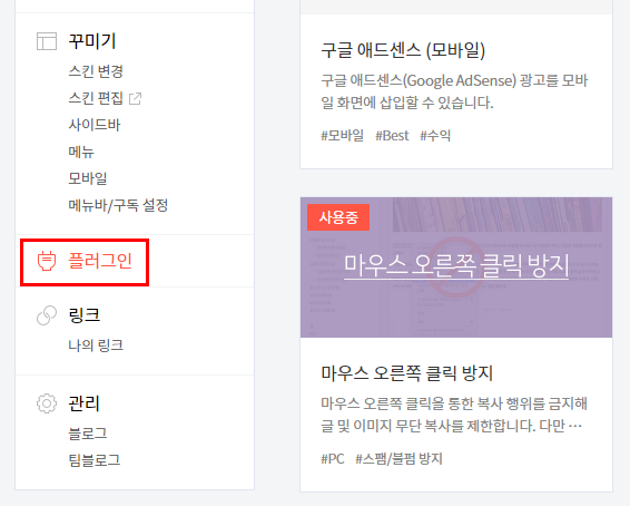 티스토리 블로그 관리자 페이지로 가시면 왼쪽 메뉴 중에서 플러그인이라는 것을 발견하실 수 있어요.