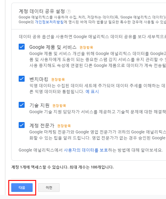 그다음은 데이터 공유 설정이라는 것이 나오는데요. 옆을 보니 권장항목이라고 적혀있네요.