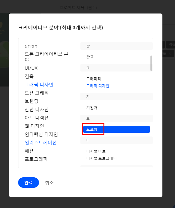 그럼 새로 뜨는 팝업창에서 원하는 분야를 고를 수 있습니다.
