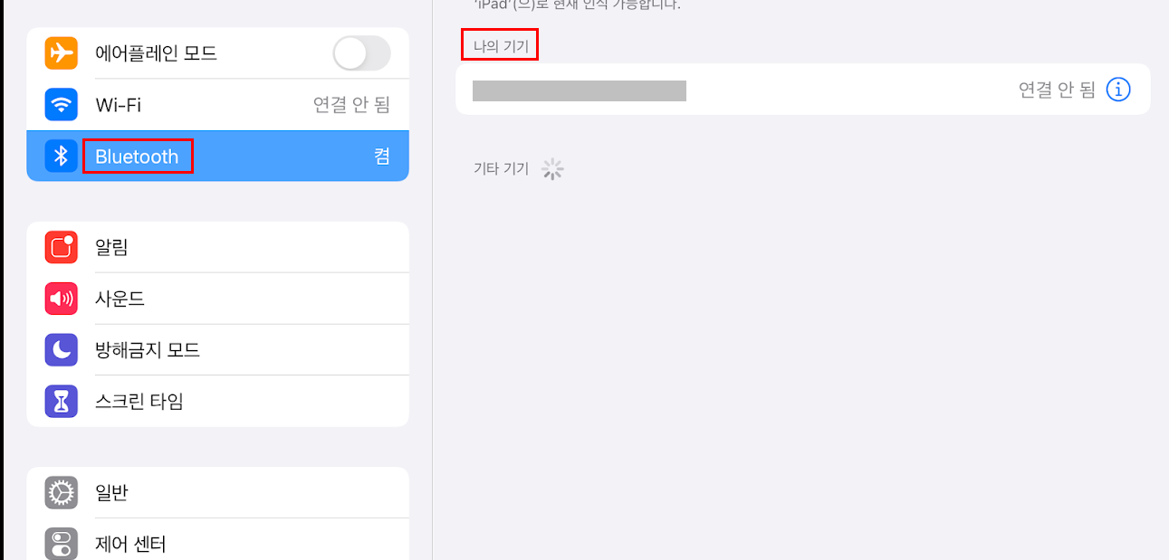 그리고 블루투스에 들어오면 나의 기기에 애플 펜슬이 연결 안 됨이 되어있을 거예요.