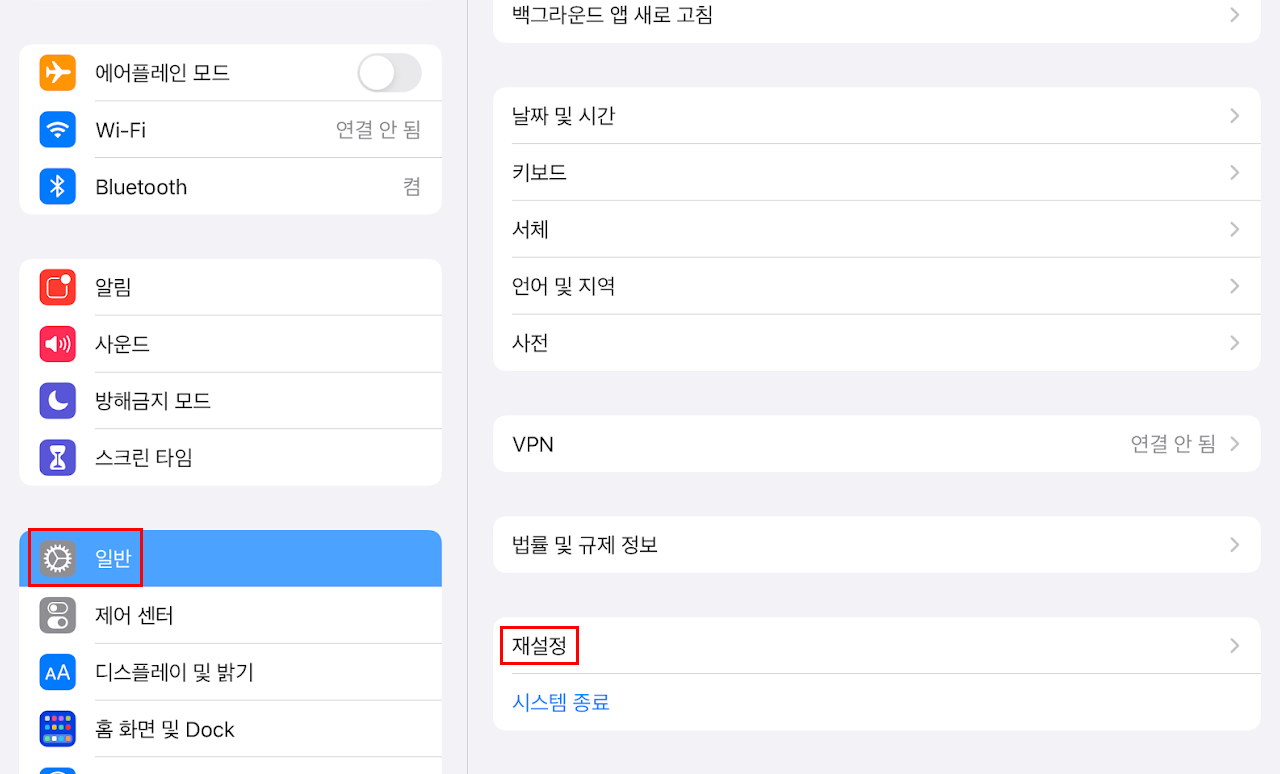 일단 설정 > 일반 > 재설정을 눌러주세요.