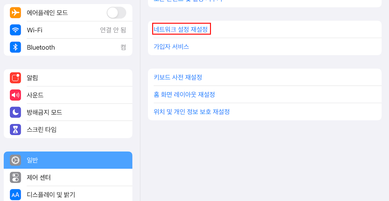 네트워크 설정 재설정을 눌러서 재설정을 해주세요.