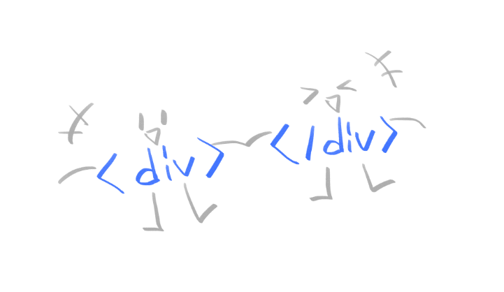 <div>가 여는 부분이고 </div>가 닫는 부분이에요. 조금 더 자세히 볼까요? /(슬래쉬)가 붙어있으면 닫는 부분이에요.