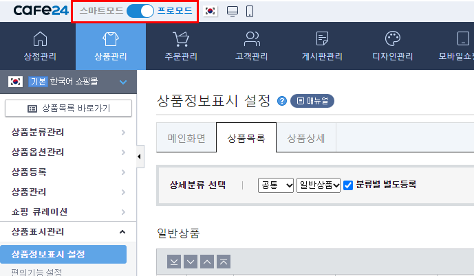 카페24 쇼핑몰 관리 페이지에 들어오시면 왼쪽 상단쯤에 스마트모드와 프로모드를 변경하는 부분이 있어요.