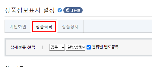 상품정보표시 설정으로 들어오면 3개의 탭이 있습니다.