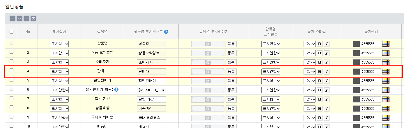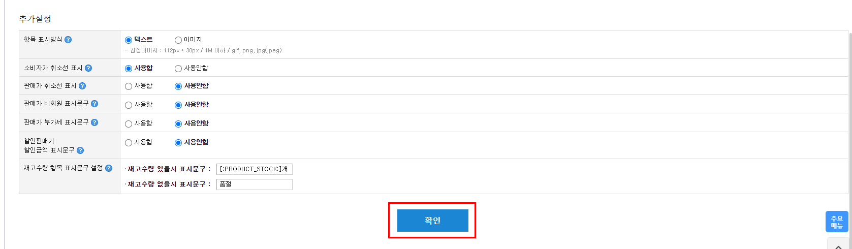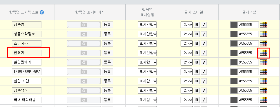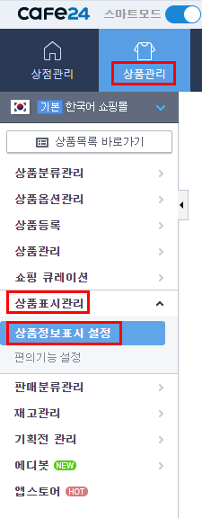 그리고 상품관리 > 상품표시관리 > 상품정보표시 설정 메뉴를 클릭해주세요.